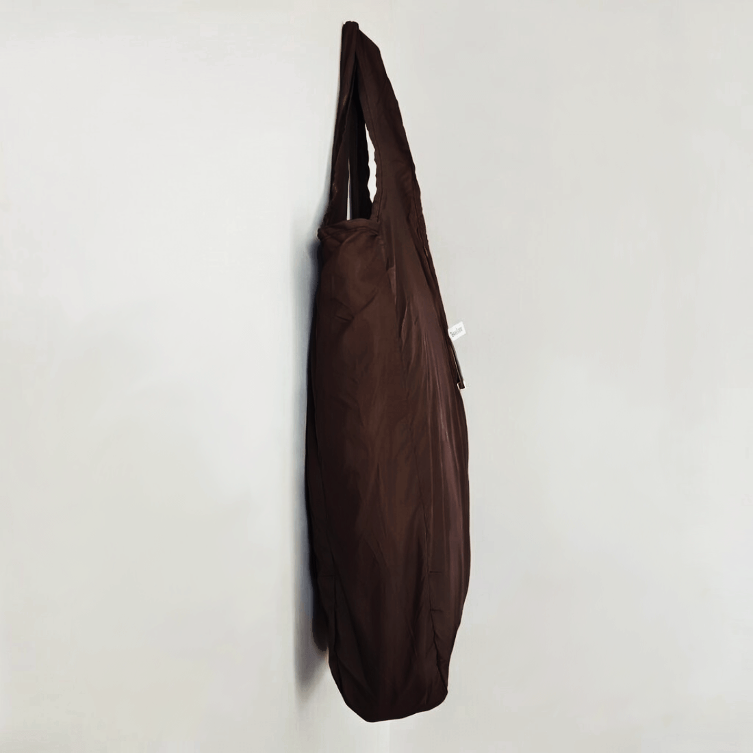 Aby złożyć Brelote, najpierw złóż uchwyty torby do środka. Następnie zwiń boki torby do środka tak, aby były szerokości breloka. Na koniec zroluj torbę ciasno i zatrzaśnij napy.